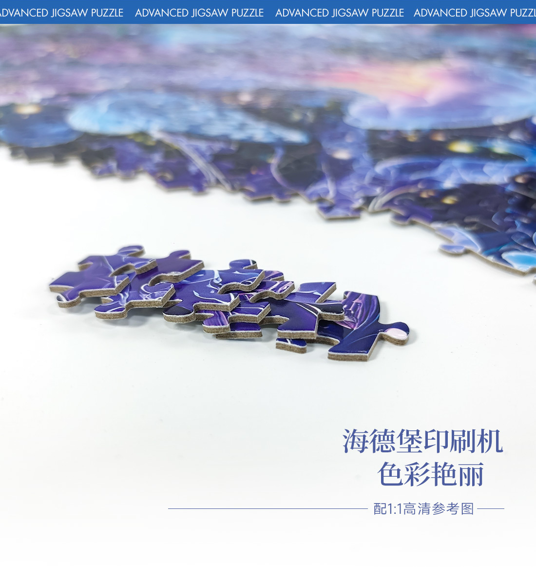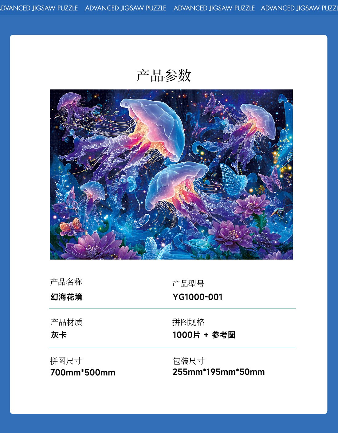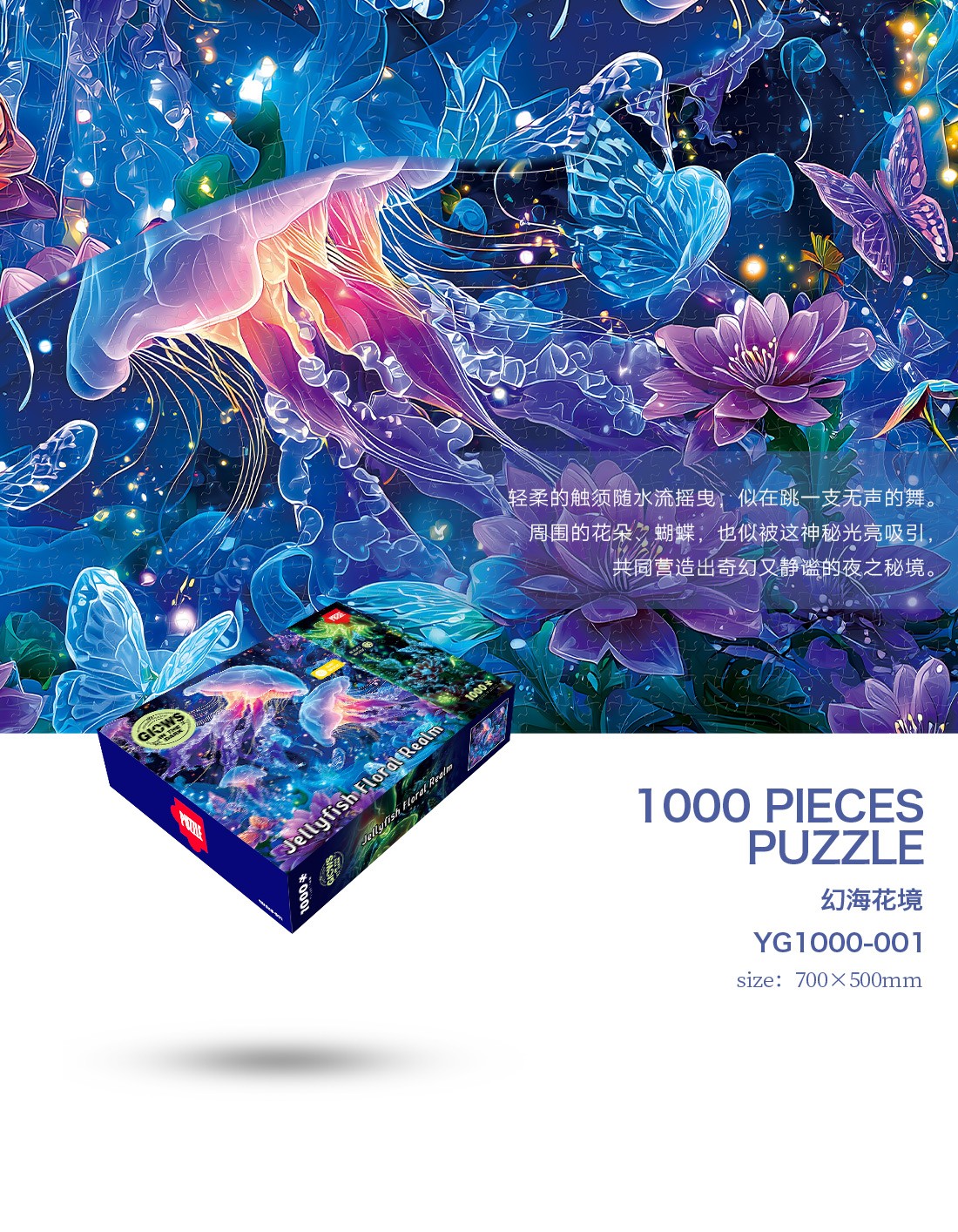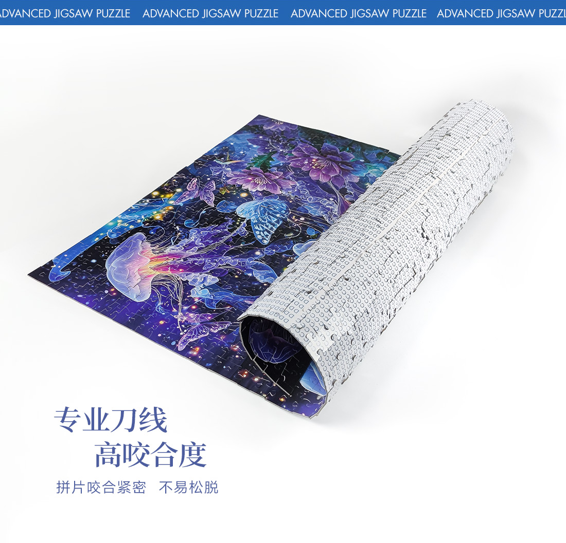 拼圖名稱:【幻海花境】夜光拼圖 拼圖尺寸:700*500MM 拼圖材質(zhì):紙質(zhì)灰卡 拼圖片數(shù):1000片 加工方式:廠規(guī)、來圖定制 包裝尺寸:180*130*50mm