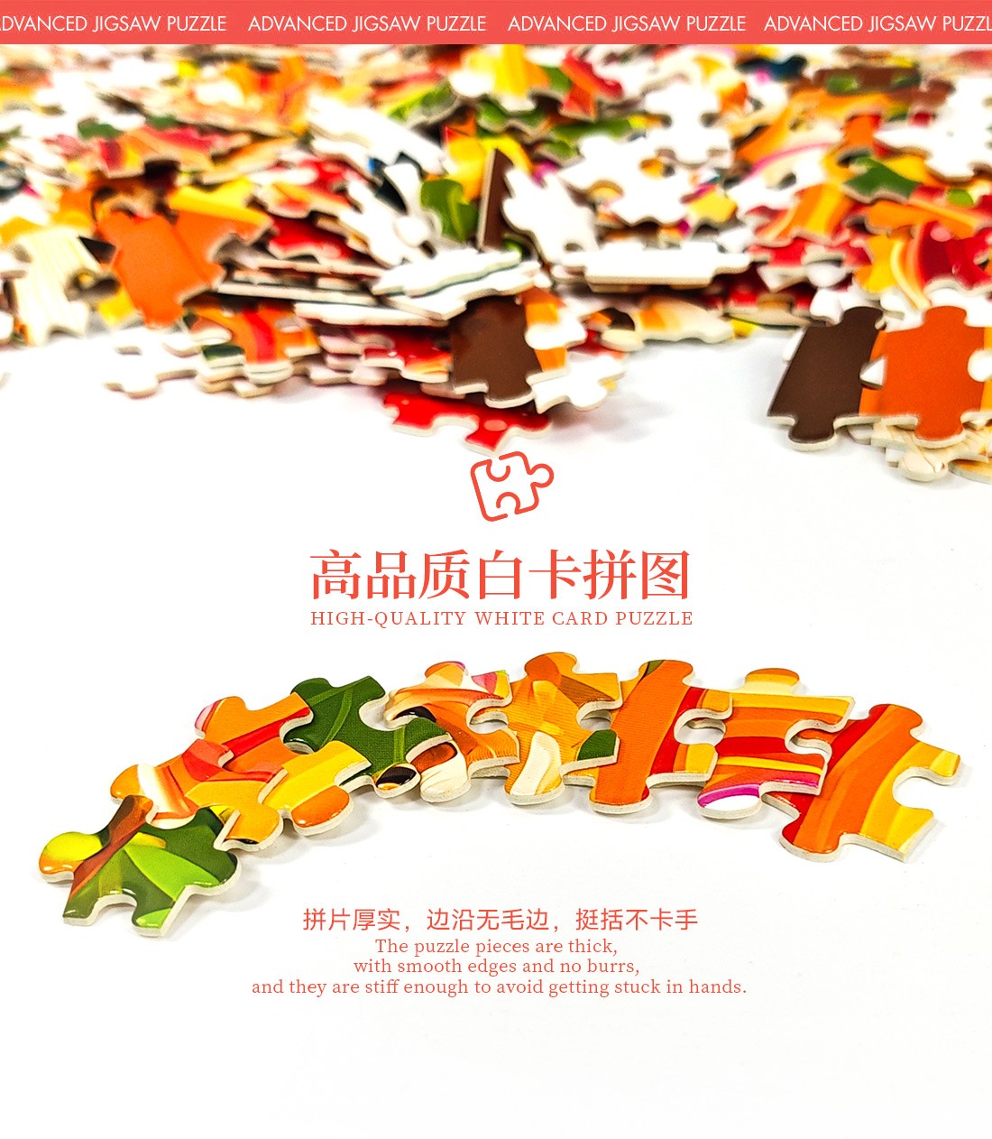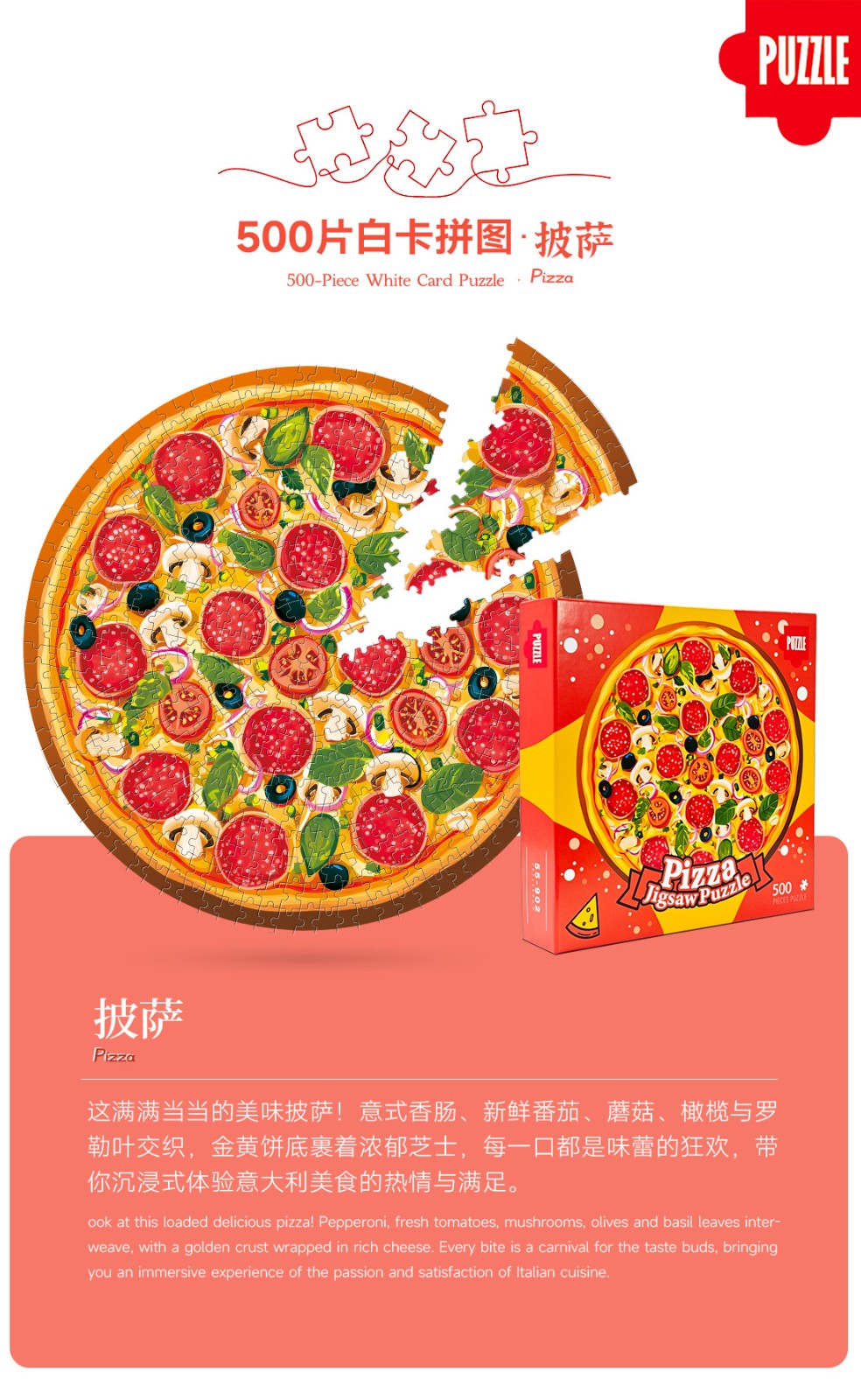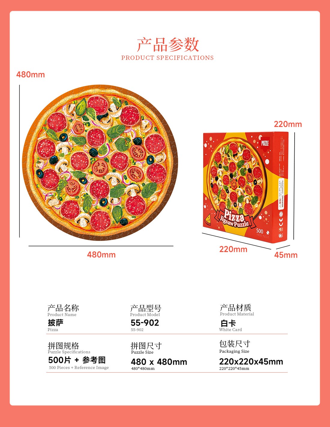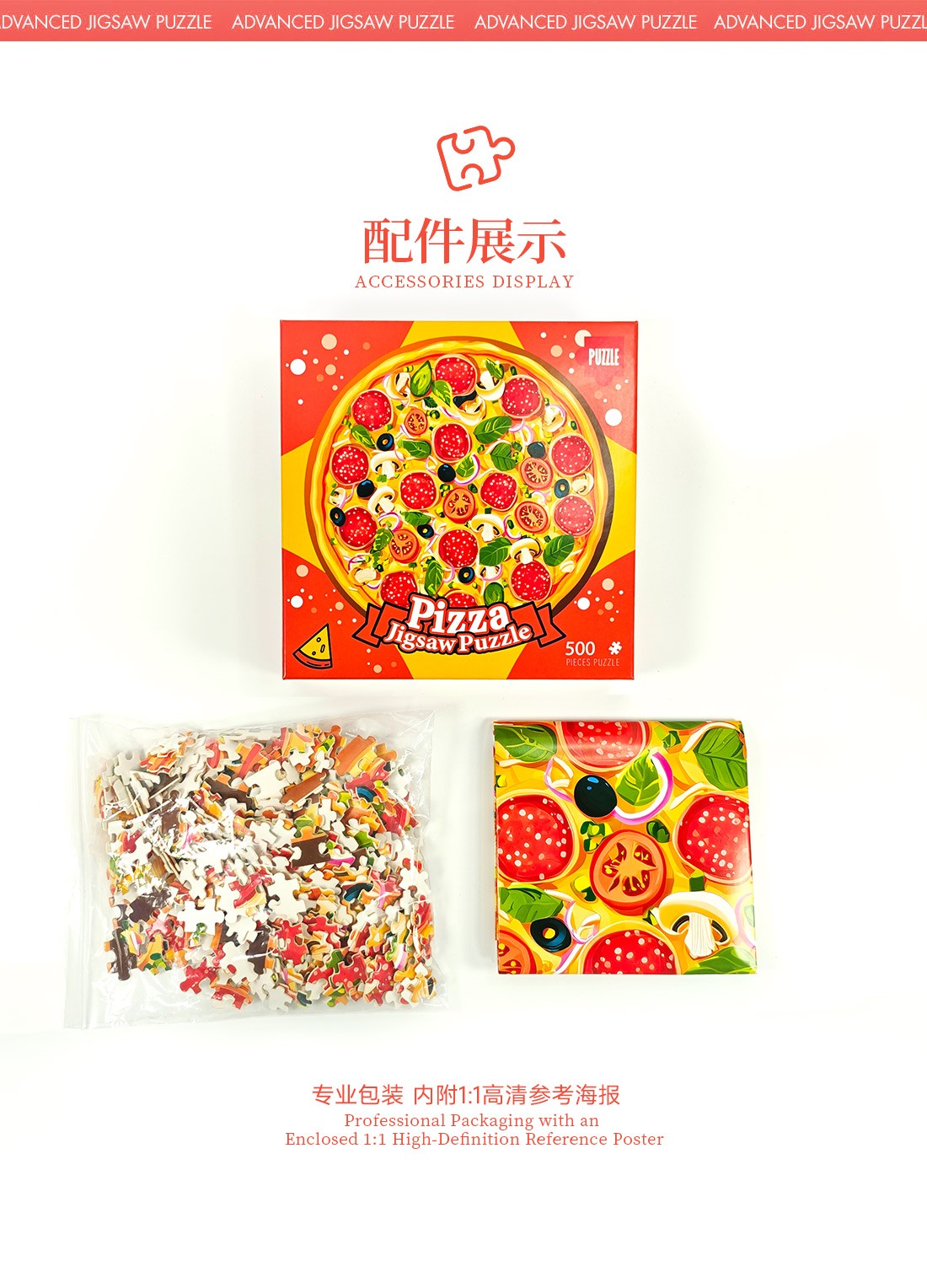 拼圖名稱:披薩-55-902 拼圖尺寸:480*480MM 拼圖材質:紙質白卡 拼圖片數:500片 加工方式:廠規、來圖定制 包裝尺寸:220*220*45mm