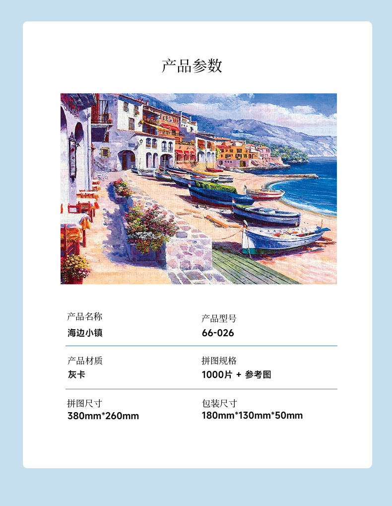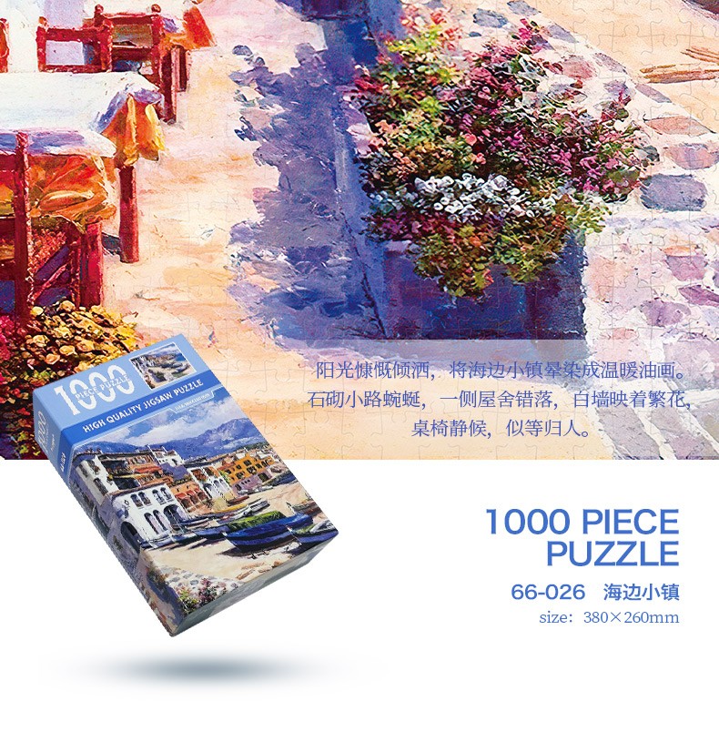 拼圖名稱:海邊小鎮(zhèn) 拼圖尺寸:380*260MM 拼圖片數(shù):1000片 加工方式:廠規(guī)、來圖定制 包裝尺寸:180*130*50mm